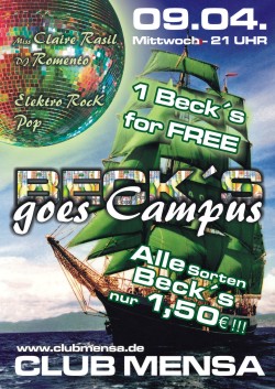 eXma verlost 1x1 Kasten Becks für dieses Event, einfach eine E-mail mit Betreff "Becks goes Campus" und als Inhalt euren bürgerlichen Namen an freikarten@exmatrikulationsamt.de schicken und mit etwas Glück gewinnen! Gewinner werden einen Tag vor der Veranstaltung per E-mail benachrichtigt.