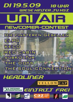 UNI AIR im Rahmen der 18. Dresdner Studententage auf der Campuswiese am Hörsaalzentrum. Aus über 40 Bewerbungen haben es 7 Band's geschafft bei diesem Newcomer-Contest um die begehrten Preise zu kämpfen: 1. Preis: Förderpreis des Studentenwerks Dresden: Finanzielle Förderung bis max. 1500 EUR und Auftritt bei der Bochumer Campusparty 2. Preis: Finanzielle Förderung bis max. 750 EUR 3. Preis: Finanzielle Förderung bis max. 500 EUR Es starteten in dieser Reihenfolge folgende Bands (mit Platzierung): 18:00 Keco (2.Platz), 18:35 subKULTur, 19:10 Red Cabin (3.Platz), 19:45 The Soul Connection, 20:20 The Dots (1. Platz), 20:55 ELPG & 21:30 Die finsteren Gesellen. 22:15 Yellow Cap, Stimmauszählung bis ca. 23:45 und dann Siegerehrung. The Insane Jokes hat leider abgesagt. Die Wertung für alle Bands erfolgt durch Stimmzettel unseres Sponsors AOK, der mit einem Promotion-Team die Zettel verteilt und wieder entgegennimmt. Je Band kann eine Schulnote von sehr gut bis ungenügend vergeben werden. Die Auszählung erfolgt nach dem Auftritt der letzten Wertungsband. Der Rechtsweg ist ausgeschlossen! Damit Euch beim Auszählen die Zeit nicht zu lang wird, haben wir als Headliner "YELLOW CAP" eingeladen. Die Siegerehrung findet ca. 23:30 Uhr statt. EINTRITT FREI! (Da diese Veranstaltung auch weiterhin Eintritt frei bleiben soll, ist das Mitbringen von Getränken nicht gestattet und wird durch die Security streng kontrolliert und eingezogen. Wir danken für Euer Verständnis. eXma verlost 10x1 Freibier für dieses Event, einfach eine E-mail mit Betreff "Uni Air" und als Inhalt euren bürgerlichen Namen an freikarten@exmatrikulationsamt.de schicken und mit etwas Glück gewinnen! Gewinner werden einen Tag vor der Veranstaltung per E-mail benachrichtigt. Hinweise zu Verlosungen Rechtsweg ausgeschlossen, Mitarbeiter des Veranstalters und des Studentenforum Dresden e.V. dürfen nicht teilnehmen.