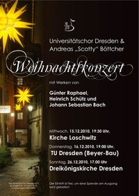Die Konzerte unter der Leitung von Maja Sequeira finden am Mittwoch, dem 15.12.2010, um 19:30 Uhr in der Kirche Loschwitz, am Donnerstag, dem 16.12.2010, um 19:00 Uhr in der TU Dresden (Beyer-Bau) sowie am Sonntag, dem 26.12.2010, um 17.00 Uhr in der Dreikönigskirche Dresden statt. Der Eintritt ist frei, um eine Spende am Ausgang wird gebeten!