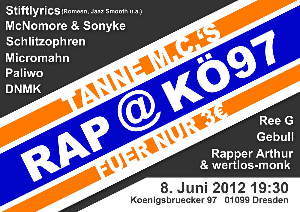 eXma verlost 2x2 Freikarten + je 2 Freibier für dieses Event, einfach eine E-mail mit Betreff "Rap@Kö97" und als Inhalt euren bürgerlichen Namen an freikarten@exmatrikulationsamt.de schicken und mit etwas Glück gewinnen! Gewinner werden einen Tag vor der Veranstaltung per E-mail benachrichtigt.