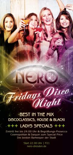 Freitag-Nacht-Fieber Freitagnacht heißt es: Ab in die Altstadt, denn hier gibt es eine Adresse, die nur an diesem Abend zum Party-Palast wird. Im NERO, nur ein paar Schritte von Dresdens unübersehbaren historischen Wahrzeichen entfernt, wird jeder Freitag zur Disco Night mit Alltimeclassics, House & Black Music.