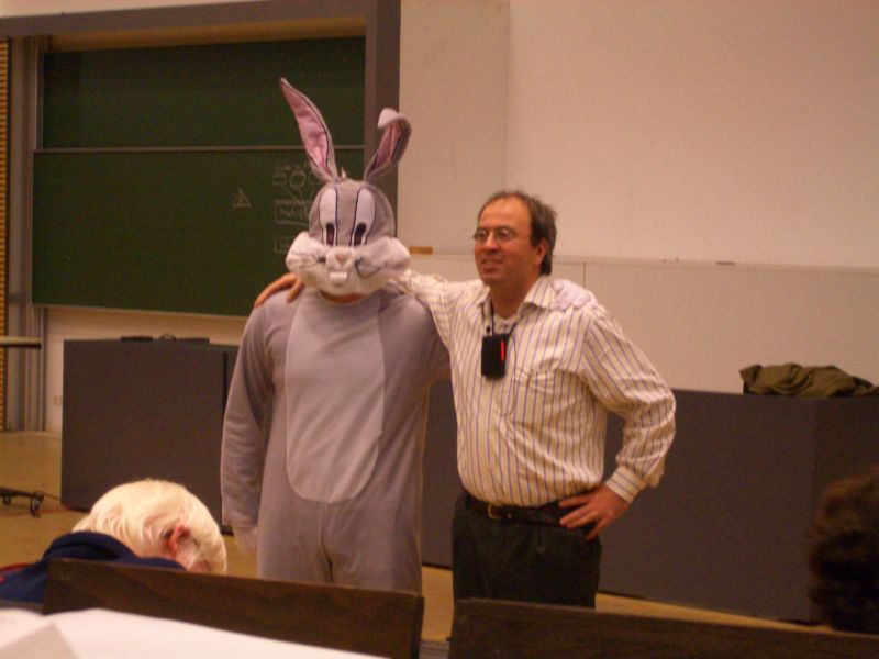 (Dresden/abd) In der Vorlesung "Privatrecht für Wirtschaftswissenschaftler" von Dr. Hans-Eric Rasmussen-Bonne kam es kürzlich zu einem frappierenden Ereignis. Am 20. November nahm ein Osterhase an der Vorlesung im Hörsaalzentrum teil! Der Student, bisher ist seine Identität unbekannt, kam als Osterhase verkleidet zur Lehrveranstaltung und nahm ganz normal daran teil. Der Dozent bewies Humor, unterbrach die Veranstaltung und forderte die Studierenden zu einem Fotoshooting auf. (Forum HERB)
