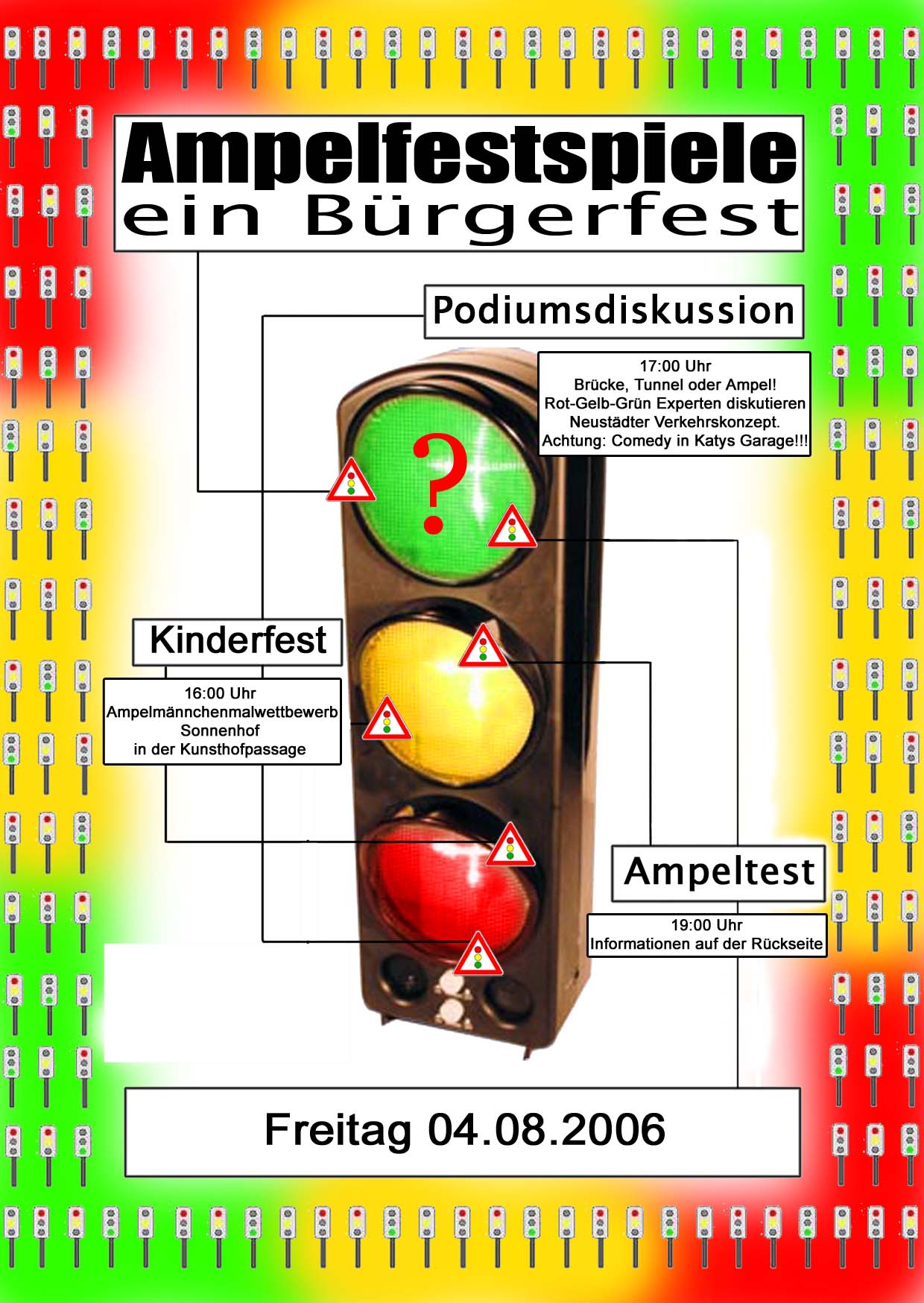 Die Ampelfestspiele laden die Neustädter Bürger zum Feiern. Beim Kinderfest im Sonnenhof (Kunsthofpassage) suchen wir das schönste Ampelmännchen. Im Katys Garagen Garten diskutieren Vertreter roter, gelber und grüner Parteien in Anlehnung an Debatten andernorts in einer Comedy-Diskussion über mögliche Brücken-, Tunnel- oder Kreisverkehr-Lösungen.