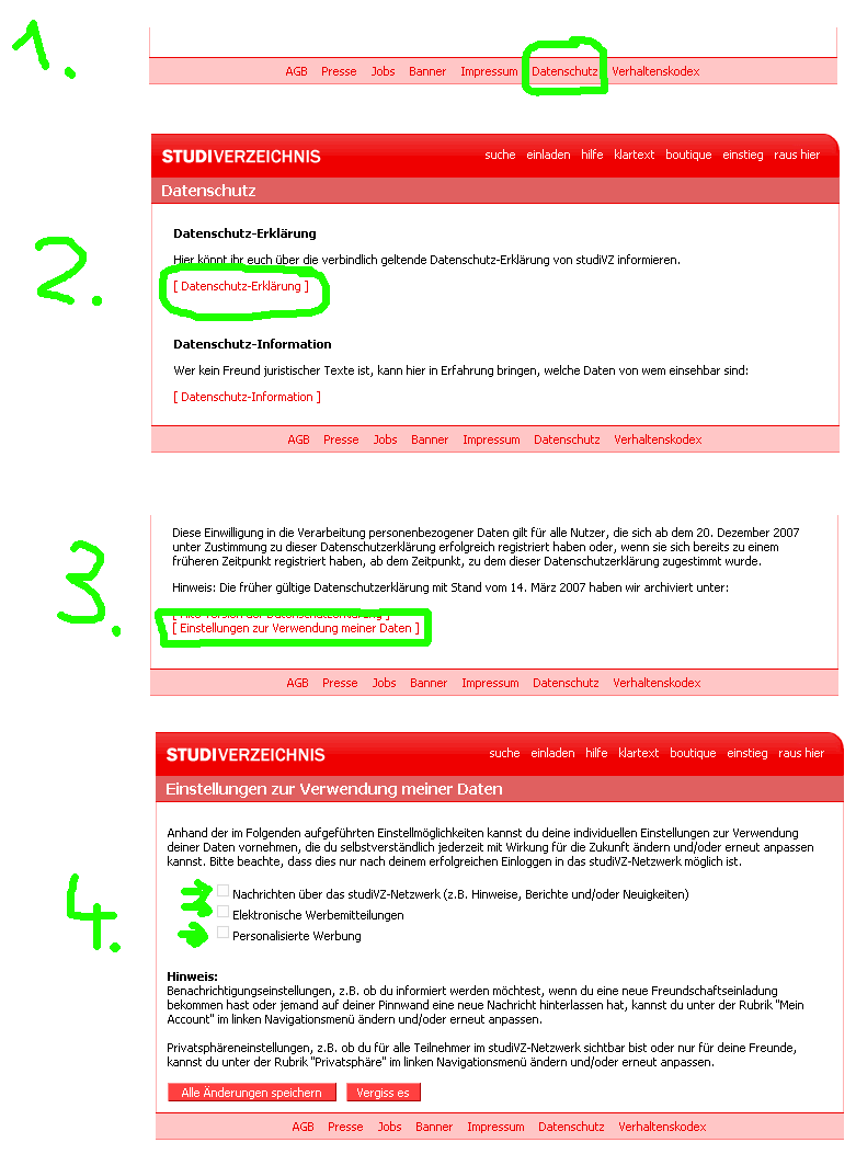 Hierzu kann ich nach dem erfolgreichen Einloggen in das studiVZ-Netzwerk in der Rubrik „Datenschutz“ am Ende des Textes zur Einwilligung in die Verarbeitung personenbezogener Daten meine Einstellungen unter „Einstellungen zur Verwendung meiner Daten“ aufrufen und anpassen.