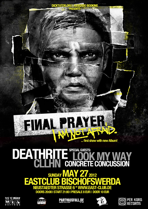 FINAL PRAYER + DEATHRITE + guests Eastclub Bischofswerda am Sonntag den 27.05.2012 Sonntag * 27. Mai 2012 Einlass 20:00 * Start 21:00 file under: Konzert * Hardcore/Punk