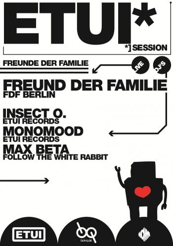 Musikalisch flankiert werden die beiden Berliner von der Etui-Chefetage Insect O., dessen aktuelle VÖ (Etui Ltd 002) "Birds Over Honkong" mit einem Marko Fürstenberg Remix aufwartet und Techno-Wizzard Monomood, dessen noch unbenannte Etui Ltd 003 bereits in den Startlöchern steht. Kurzentschlossen konnten wir noch Max Beta von den Dresdener Geheimnishasen dazu begeistern, den frühen Morgen mit einer bunten Mischung aus 4/4 Allerlei zu bereichern.