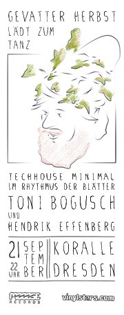 Heute werden euch Hendrik Effenberg (Bau Records, Leipzig) und Toni Bogusch (Vinylstars Booking/Mooose Records, Dresden) in Empfang nehmen und das Tanzbein im Rhythmus der Blätter in den Herbst schwingen lassen.