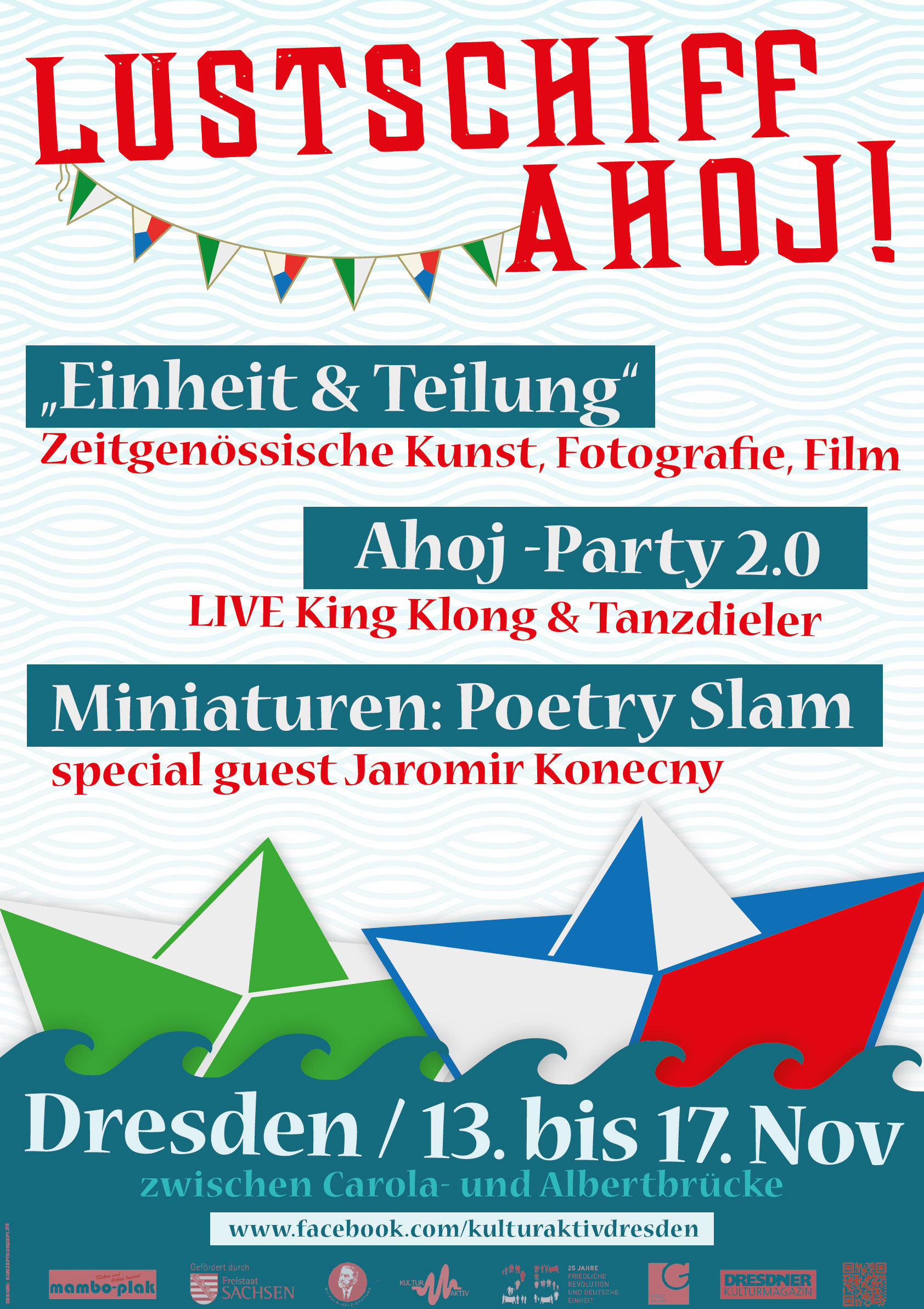 Zw. Carola- und Albertbrücke am Samstag den 14.11.2015 After-Show zur Preisverleihung des Deutschen Karikaturenpreises / LIVE mit King Klong und den Tanzdieler DJs Dr. Hustler und Larre.me / Außerdem Begrüßungsdrink aus der Käpt'n's Reserve und Ausstellung „Einheit & Teilung“