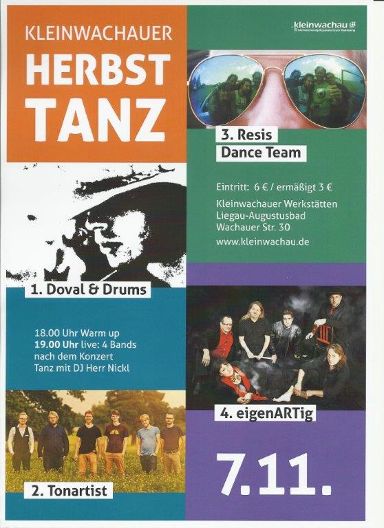 Kleinwachauer Werkstätten Radeberg am Samstag den 07.11.2015 Zum alljährlichen Herbsttanz in Kleinwachau (Radeberger Ortsteil Liegau-Augustusbad) werden sich diesmal gleich 4 Bands die Ehre geben. Live ab 19:00 : Doval&Drums, Tonartist, ResisDanceTeam und eigenARTig