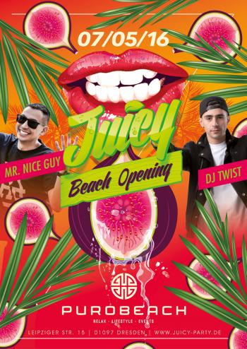 Endlich startet die schönste Jahreszeit. Endlich wieder Sommer, Sonne, Strand & JUICY! Das Beach Opening in der Sommerresidenz der saftigsten Urban-Music-Party im gesamten ostdeutschen Raum läutet die Open Air Saison inkl. Pool und Cocktails ein.