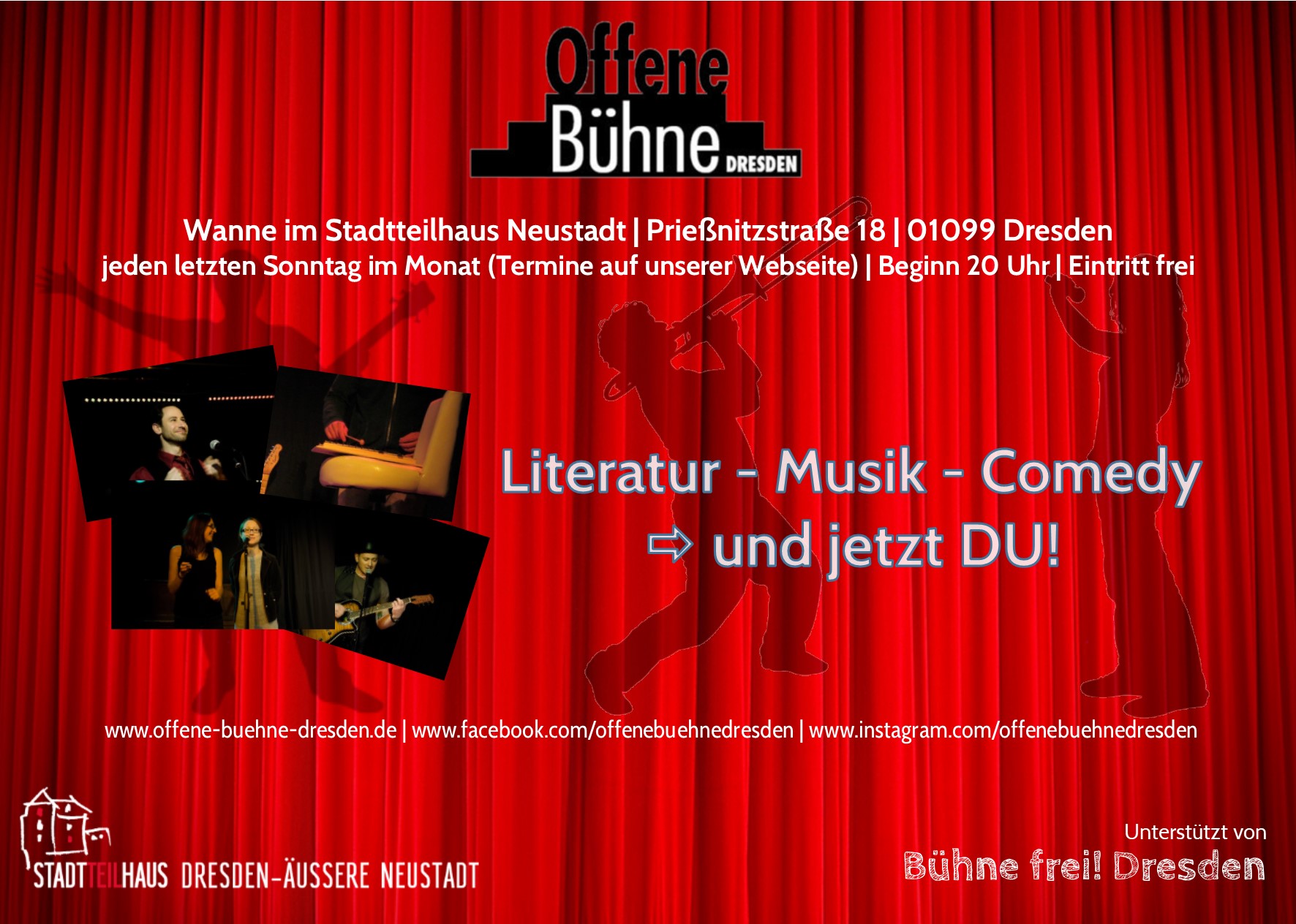 Wir suchen DICH! Wir haben noch reichlich Platz in unserem Programm. Jetzt einen Platz auf der Bühne sichern: https://www.offene-buehne-dresden.de/mitmachen/