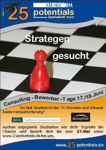 Bewerbung 25potentialsDas Dresdner Top-Student Forum 25potentials ist zum Greifen nah! Im Rahmen dieses Forums bietet AIESEC in Dresden Dir (Absolvent der TU-Dresden oder noch Student im Hauptstudium) eine ganz besondere Chance den ersten Schritt zum Berufseinstieg in die Unternehmensberatungen Boston Consulting Group oder BearingPoint zu machen! Im Rahmen eines exklusiven Workshopwochenendes im Art'Otel bietet sich Dir am 17. und 18. Juni die Chance die beiden Unternehmen hautnah kennenzulernen.
