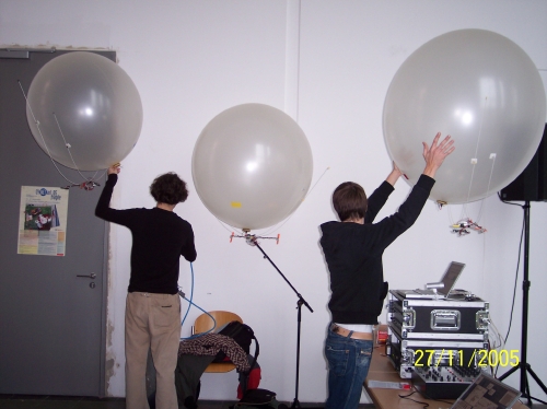 Man konnte 6 -7 Heliumballons betrachten die eine Sensorik und mehrere Elektromotoren mit Propeller